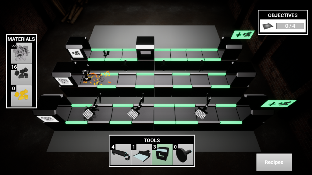 The player is tasked with discovering materials by placing tools on assembly lines to modify existing materials traveling down the lines. When the tools activate, they emit sound effects that subtly encourage the player to create songs and beats as they complete the levels.